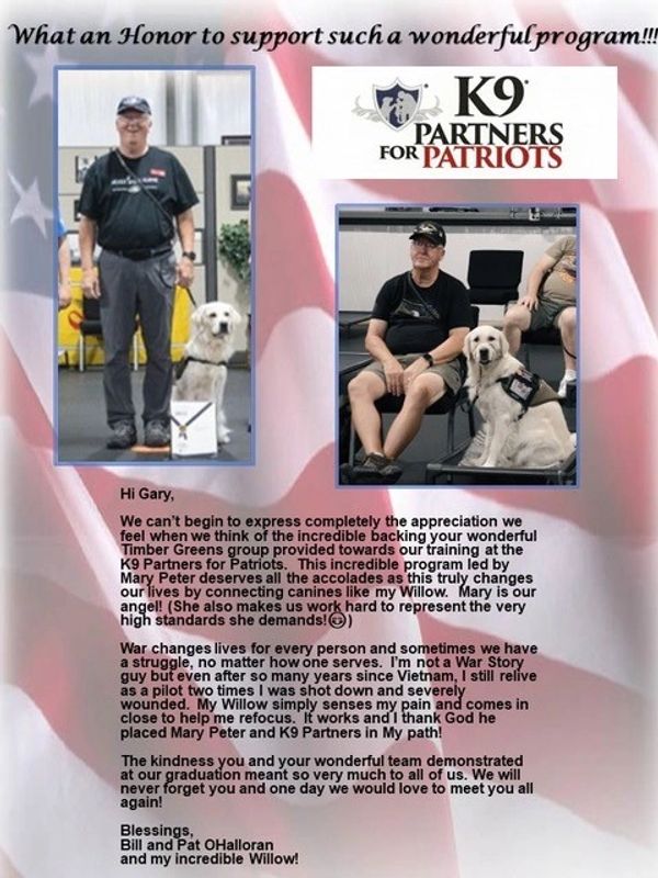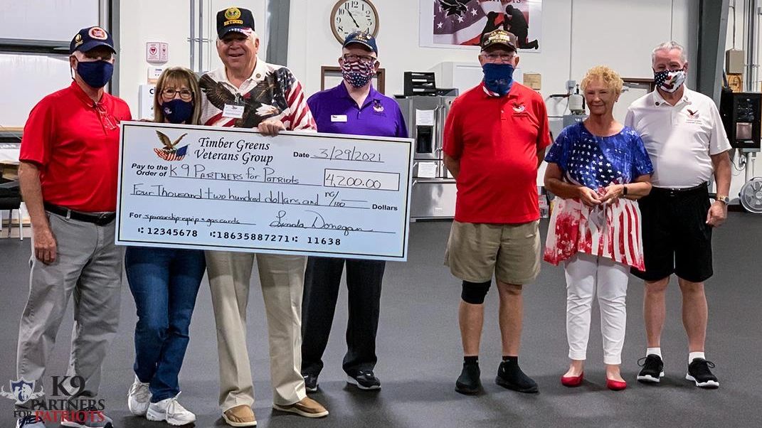 Since 2017, Timber Greens Veterans Group has donated over $13,000 to K9 Partners for Patriots in Brooksville, FL.