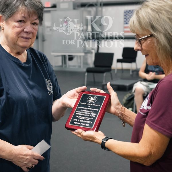 Karen Weyer, Gary's wife, presented a check to K9P4P with the proceeds of the Gary Weyer Remembrance Fund. Thank you to all who donated to this fund and made this gift possible.